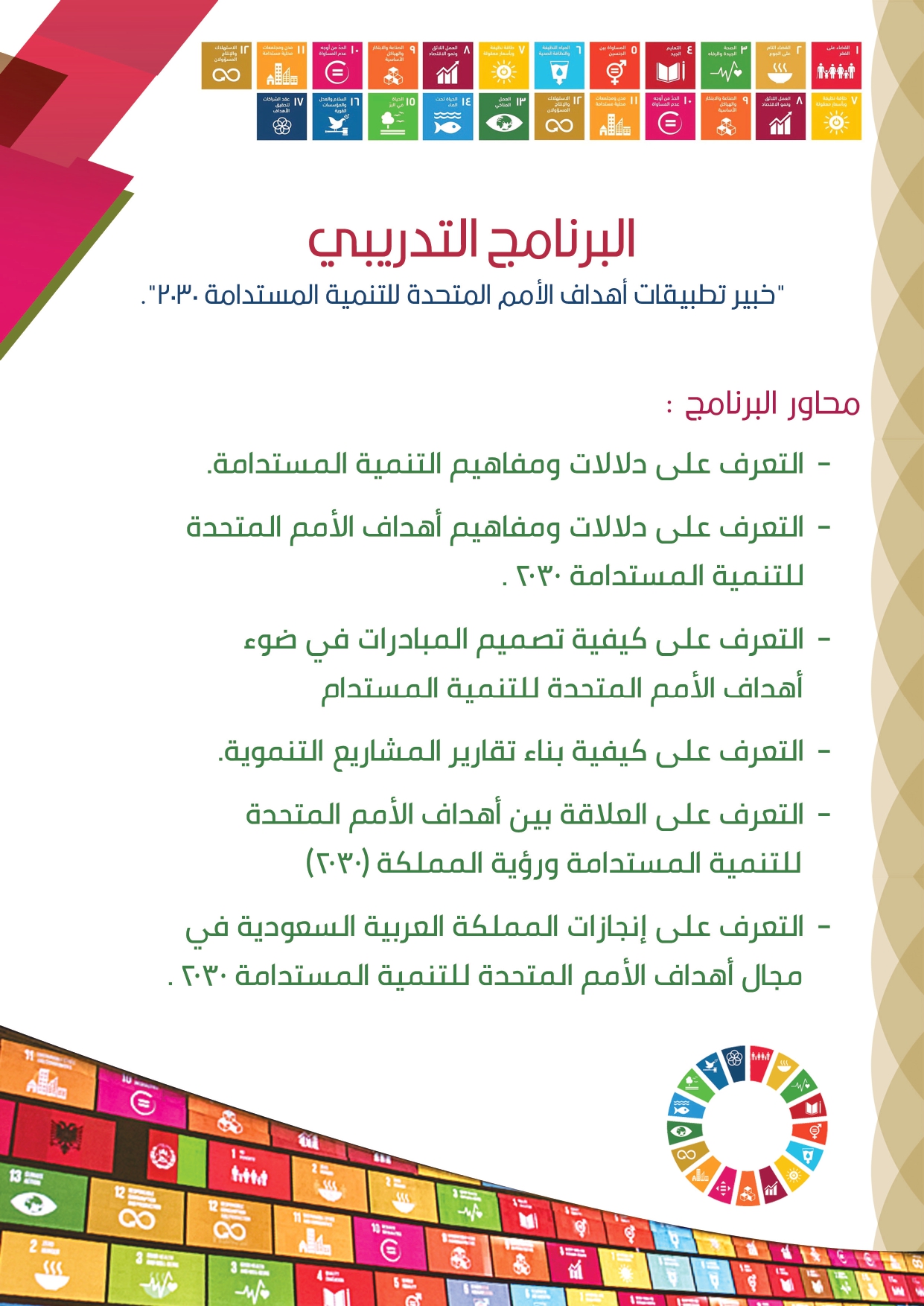 ولأهمية الدور التي تتبناه المؤسسات التنموية المختلفة في تطوير مجالات التنمية بشكل عام انطلاقا من المجتمع ووصولا لدوائر أكثر اتساعا، ورغبة في بناء جهد مؤسسي لهذه المؤسسات في مجالات التنمية ومن أهمها الخطط التنموية المحلية والعالمية، ولأن أهداف الأمم المتحدة للتنمية المستدامة2030، تعد من أهم الخطط التنموية على مستوى العالم، وتأكيداً على الاستفادة من دلالات هذه الخطة العالمية، فإننا نقدم برنامجاً تدريبياً تحت مسمى " خبير تطبيقات أهداف الأمم المتحدة للتنمية المستدامة 2030 " وذلك بهدف دفع المؤسسات التنموية لتولى دور أكبر في مجال تحقيق متطلبات الأهداف الأممية، الأمر الذي يؤمل منه أن ينعكس إيجاباً على إحداث أثر مستدام في مجالات التنمية المختلفة، وكذلك دعم جهود المملكة في التفاعل مع هذه الأهداف العالمية.